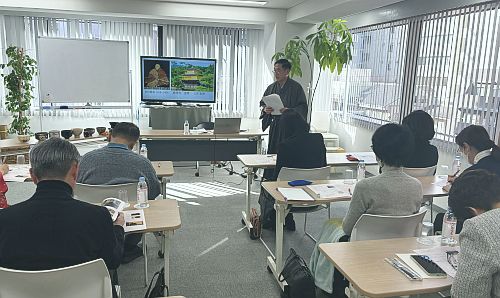 セミナーは、会場参加とオンライン(Zoomライブ配信)のハイブリッド形式で実施し、合計約30名の方にご参加いただきました。受講者の中には、以前当協会が主催した裏千家東京出張所での「茶の湯」講座を受講されたことがある方も多く、熱心にメモを取りながら聞き入っていらっしゃいました。